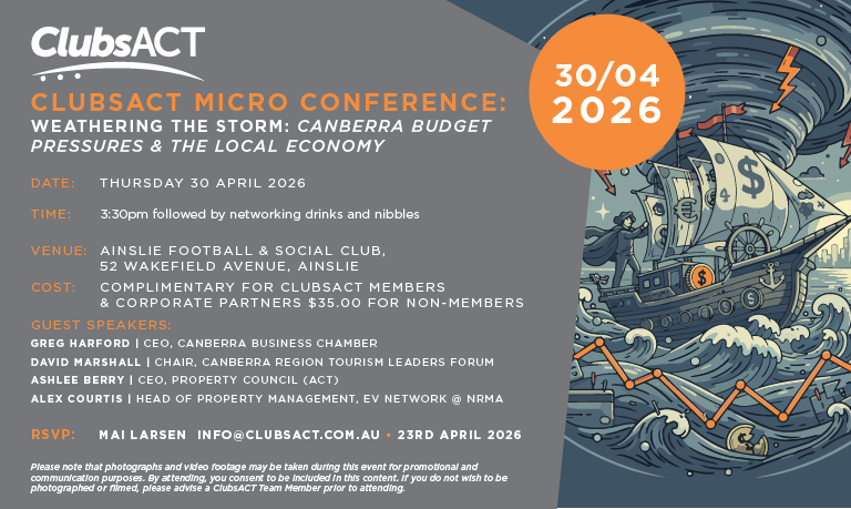 Join us for the upcoming ClubsACT Micro-Conference, “Weathering the Storm: Canberra Budget Pressures & the Local Economy,” bringing together leading voices to unpack the challenges and opportunities shaping our region.